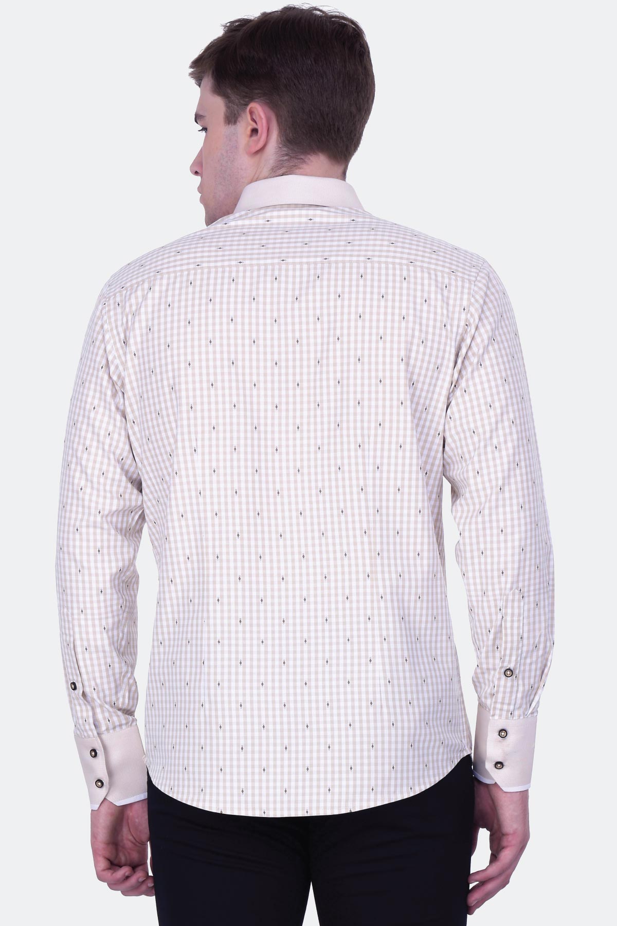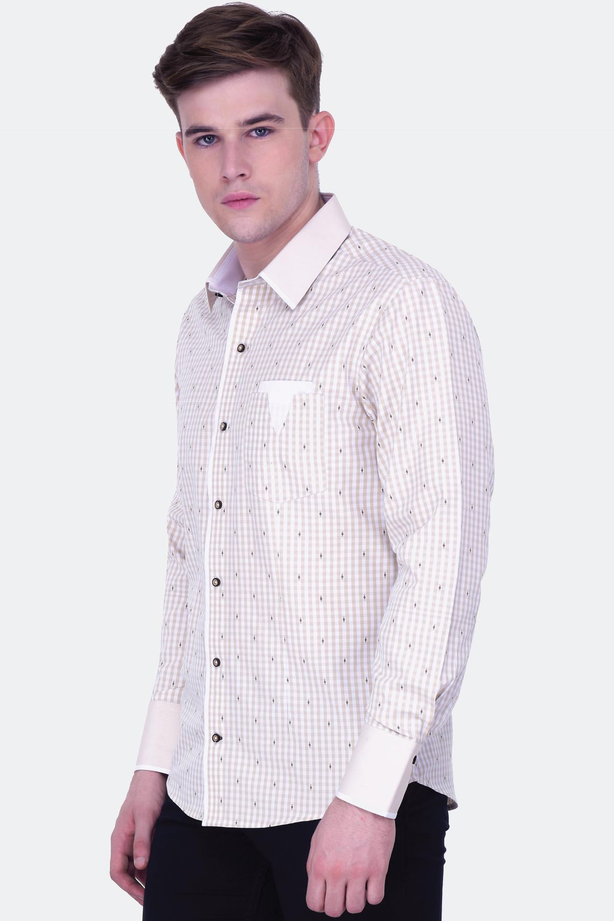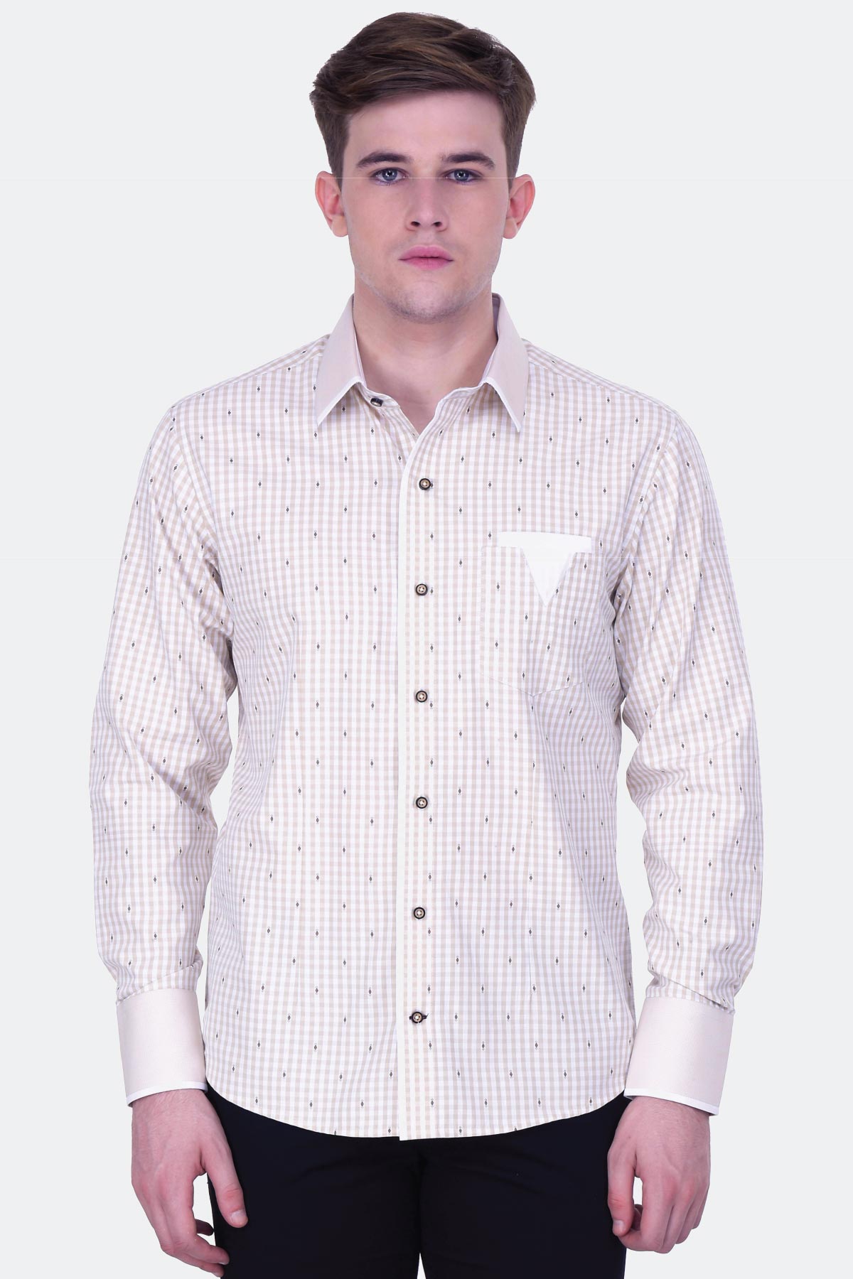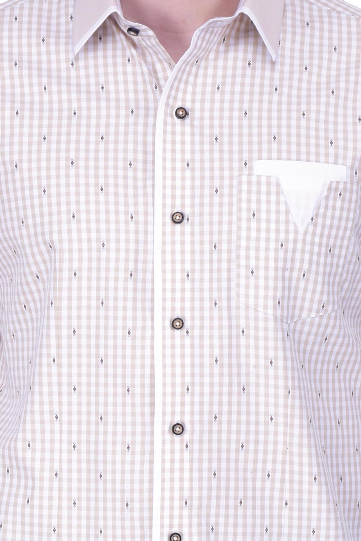 This checked beige shirt with brown jacquard buta merges style and comfort perfectly. Made from a blended fabric in a regular fit, this design features a stylized pocket and a micro gingham collar. Wear it with black denim and sneakers for a trendy look.