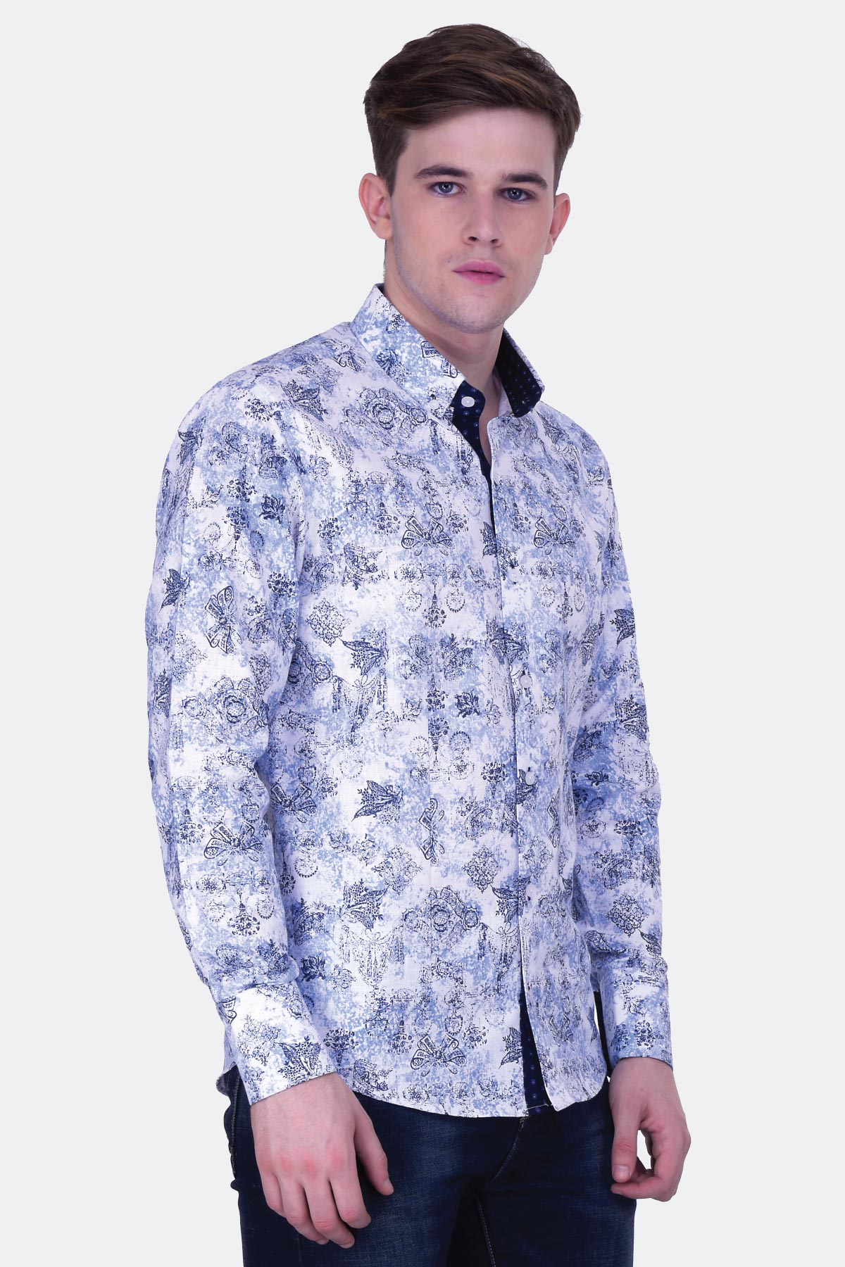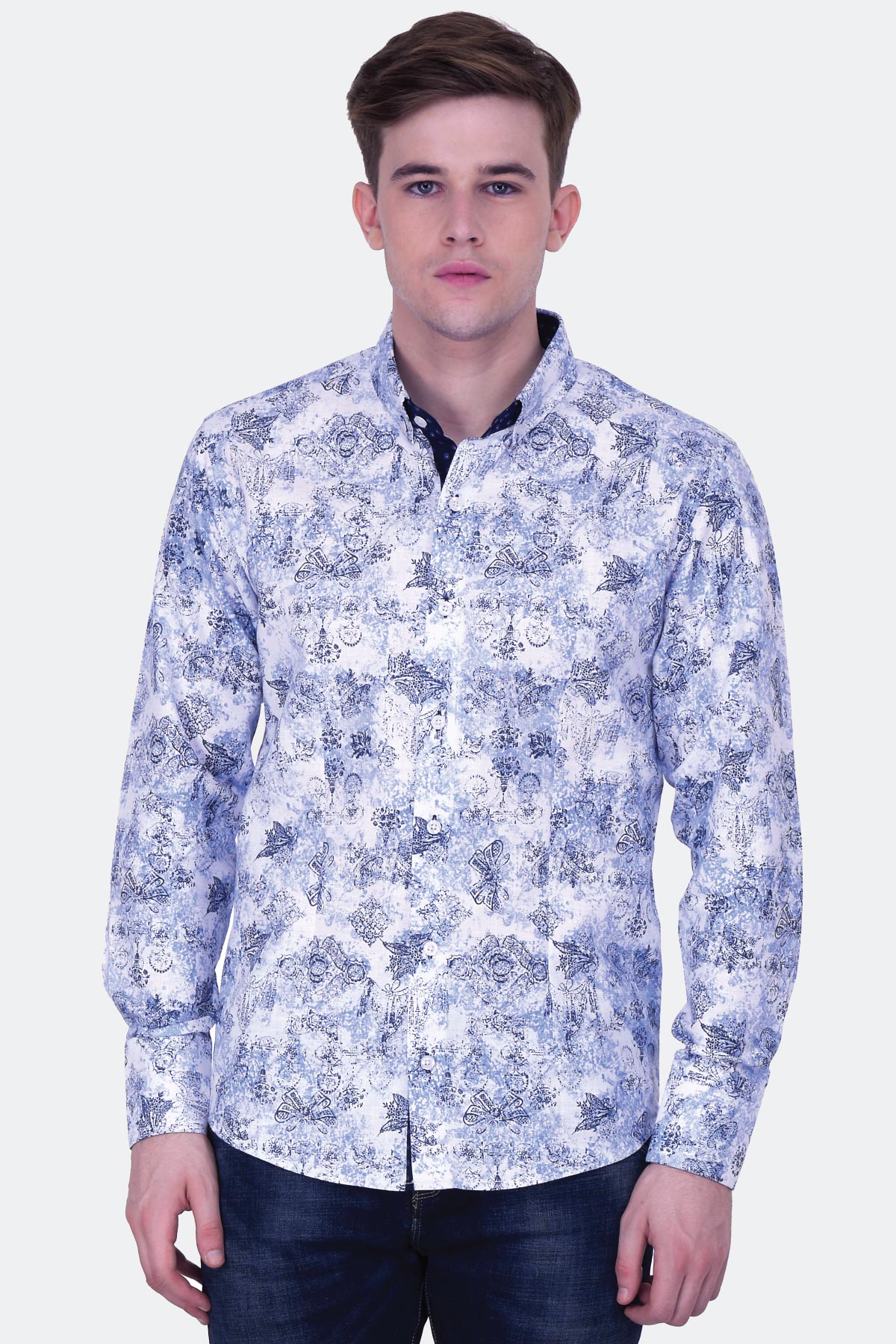 Win the game of style with this all-over indigo printed white shirt. Made from cotton in a regular fit, this design features contrast inner placket and cuffs. Wear it with mid washed denim and loafers for added suave.