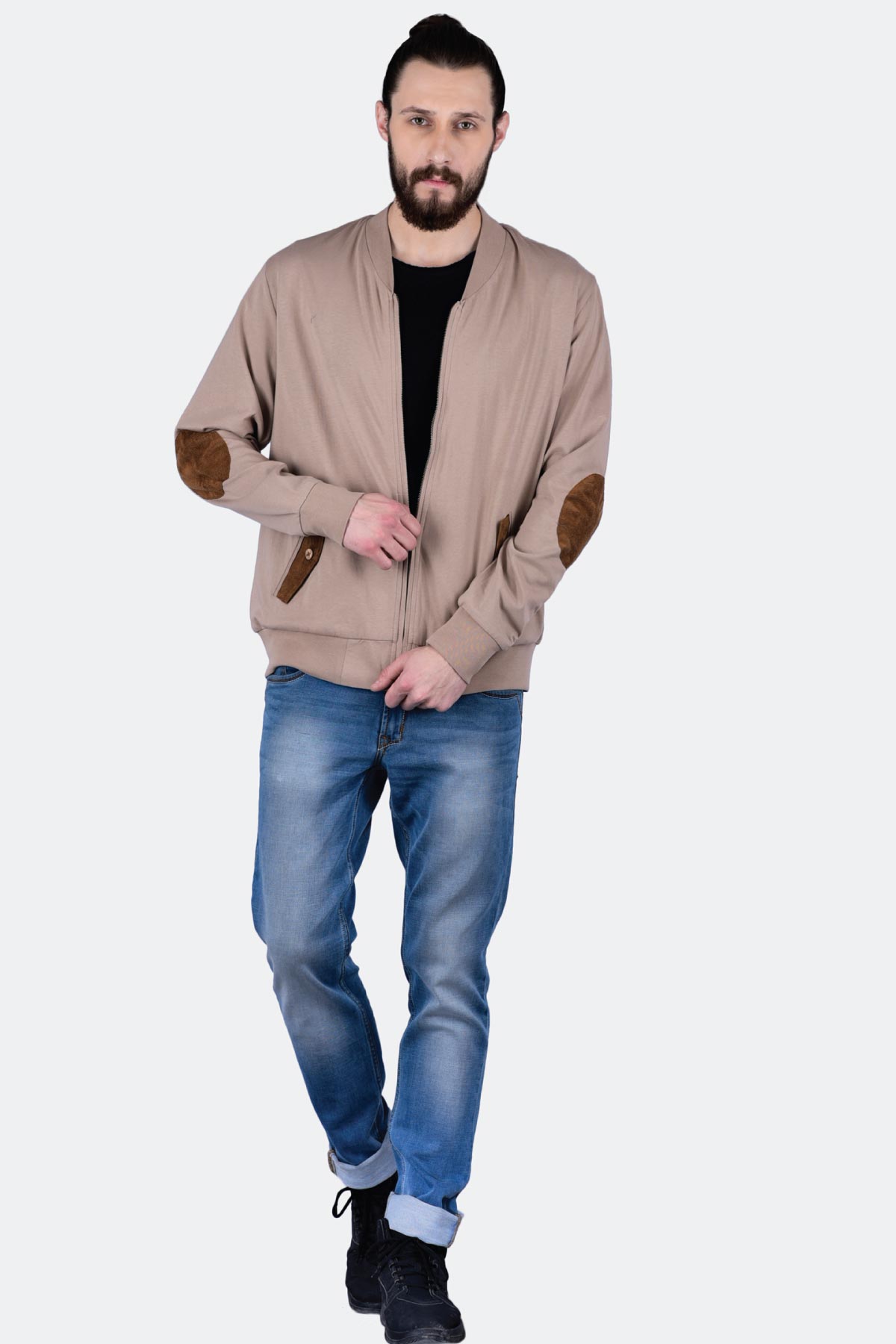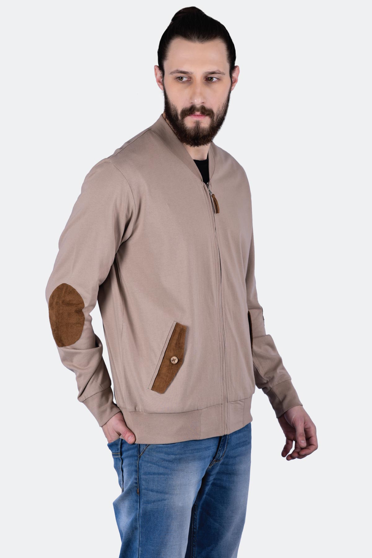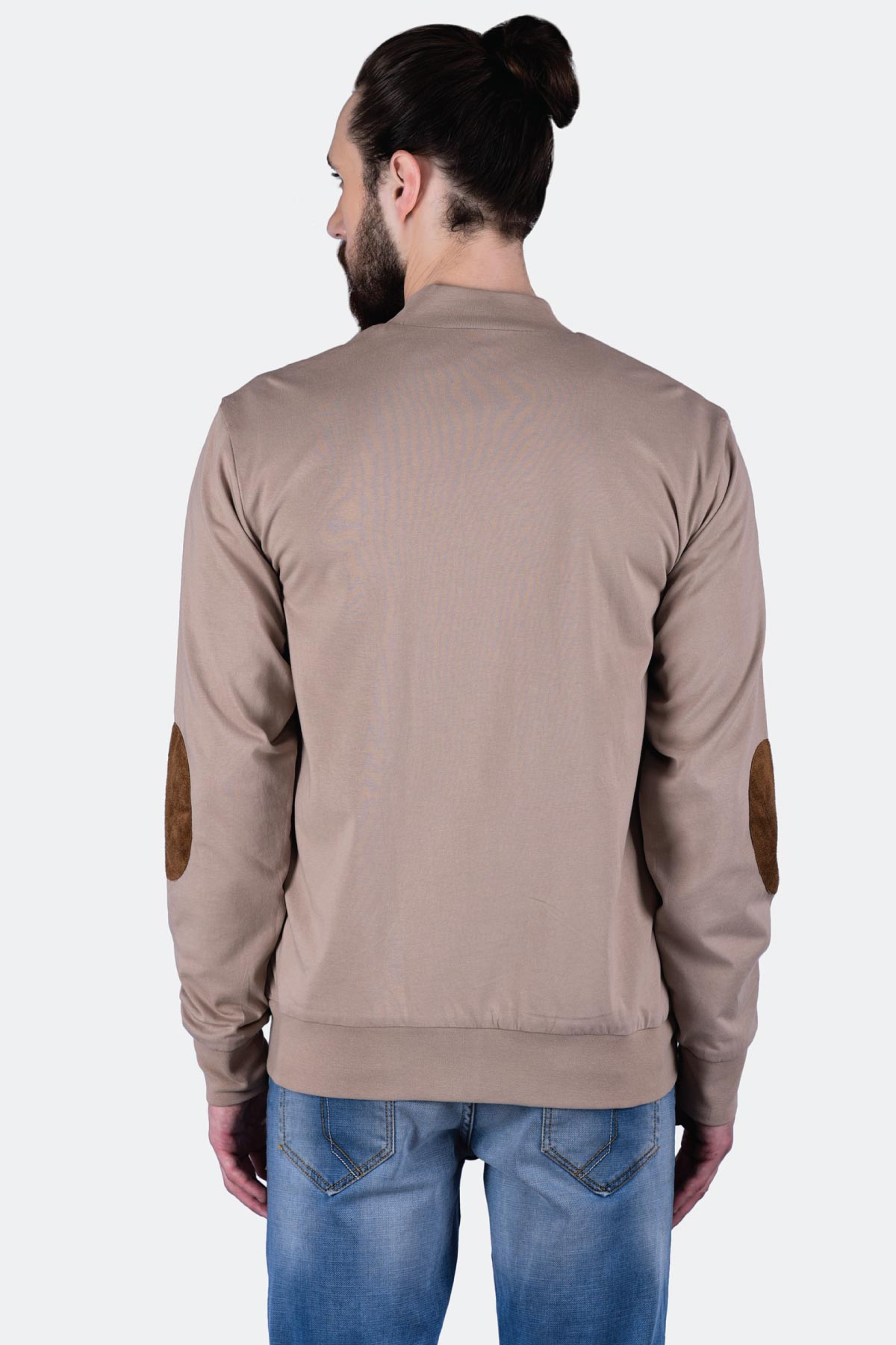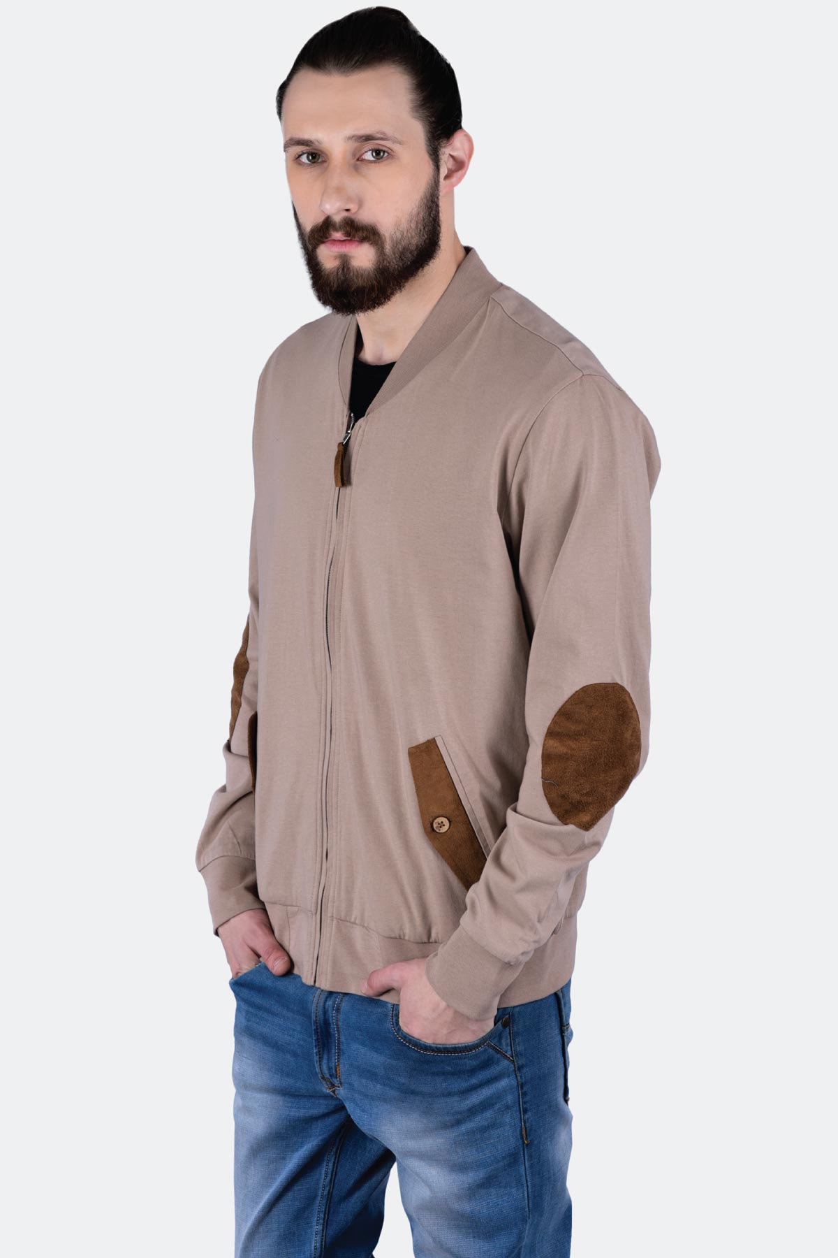 Designed to give you a suave look, this sand coloured knitted terry jacket is a must-own. The design comes with a zip front opening, a suede elbow patch and pocket flaps. Wear it with a V-neck black T-shirt, denim and loafers