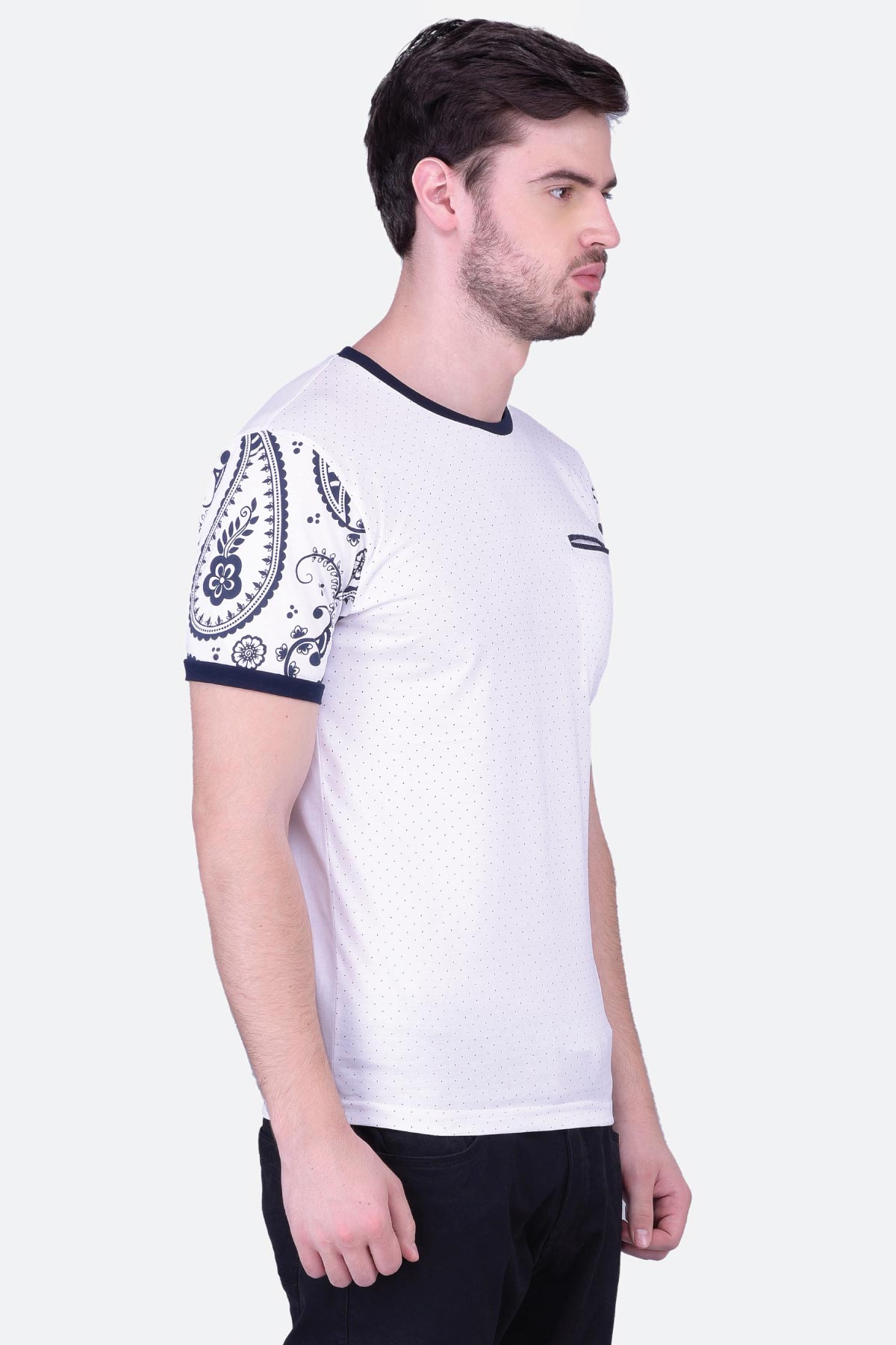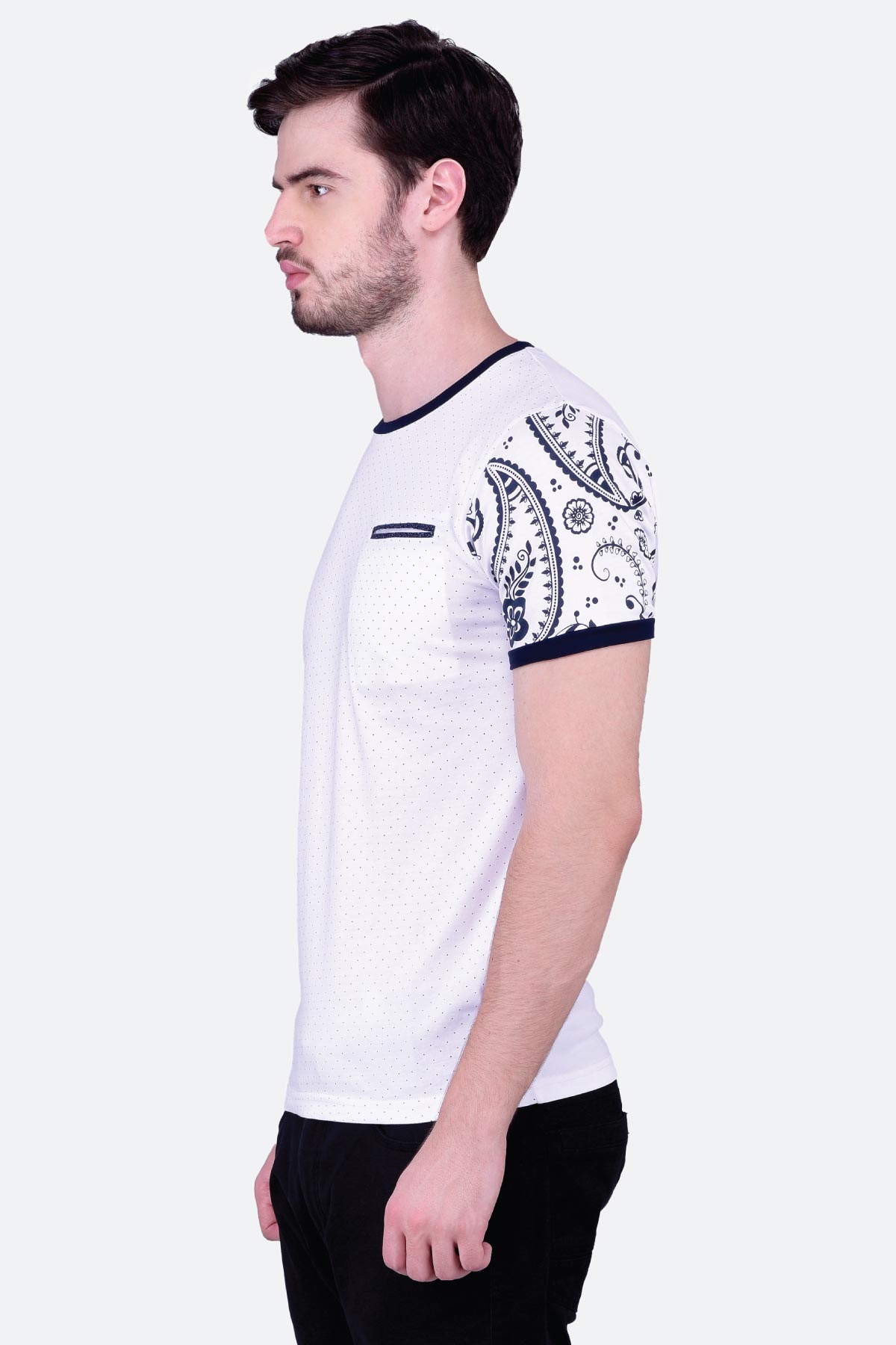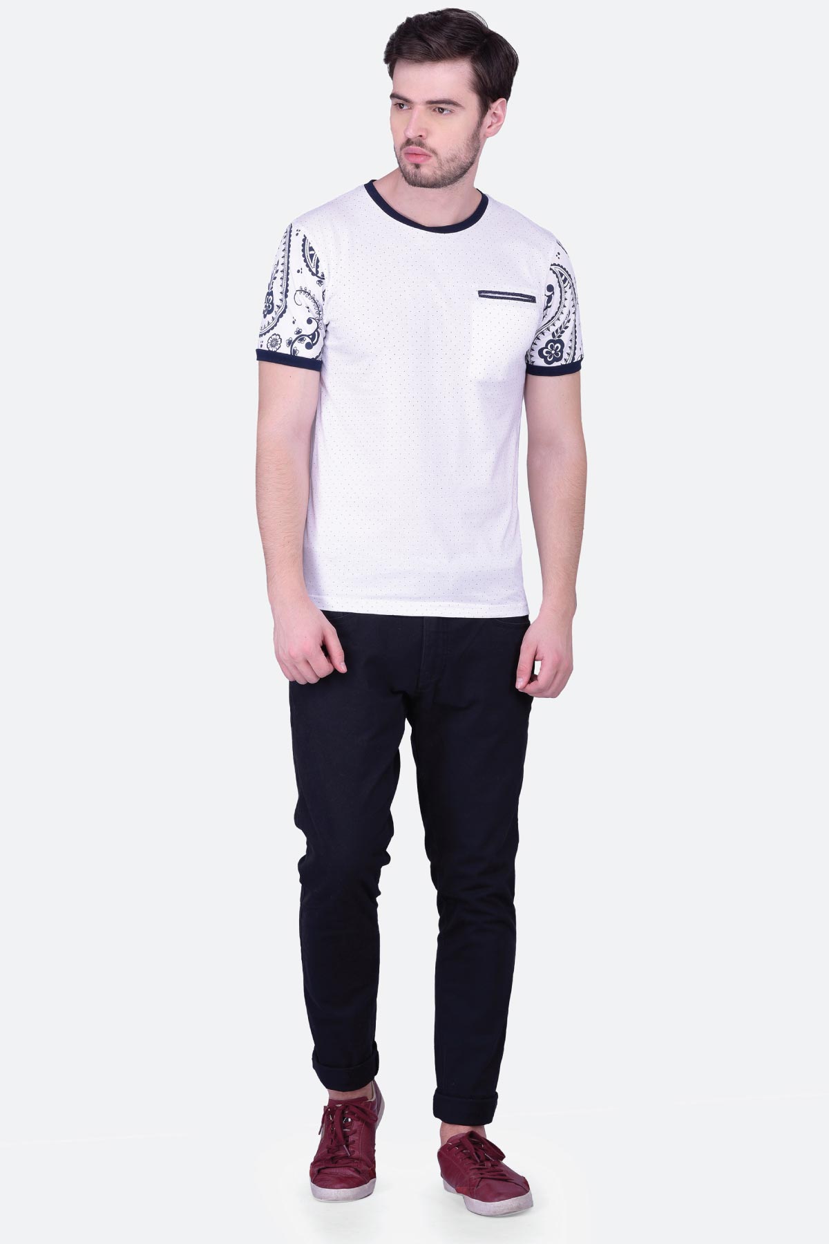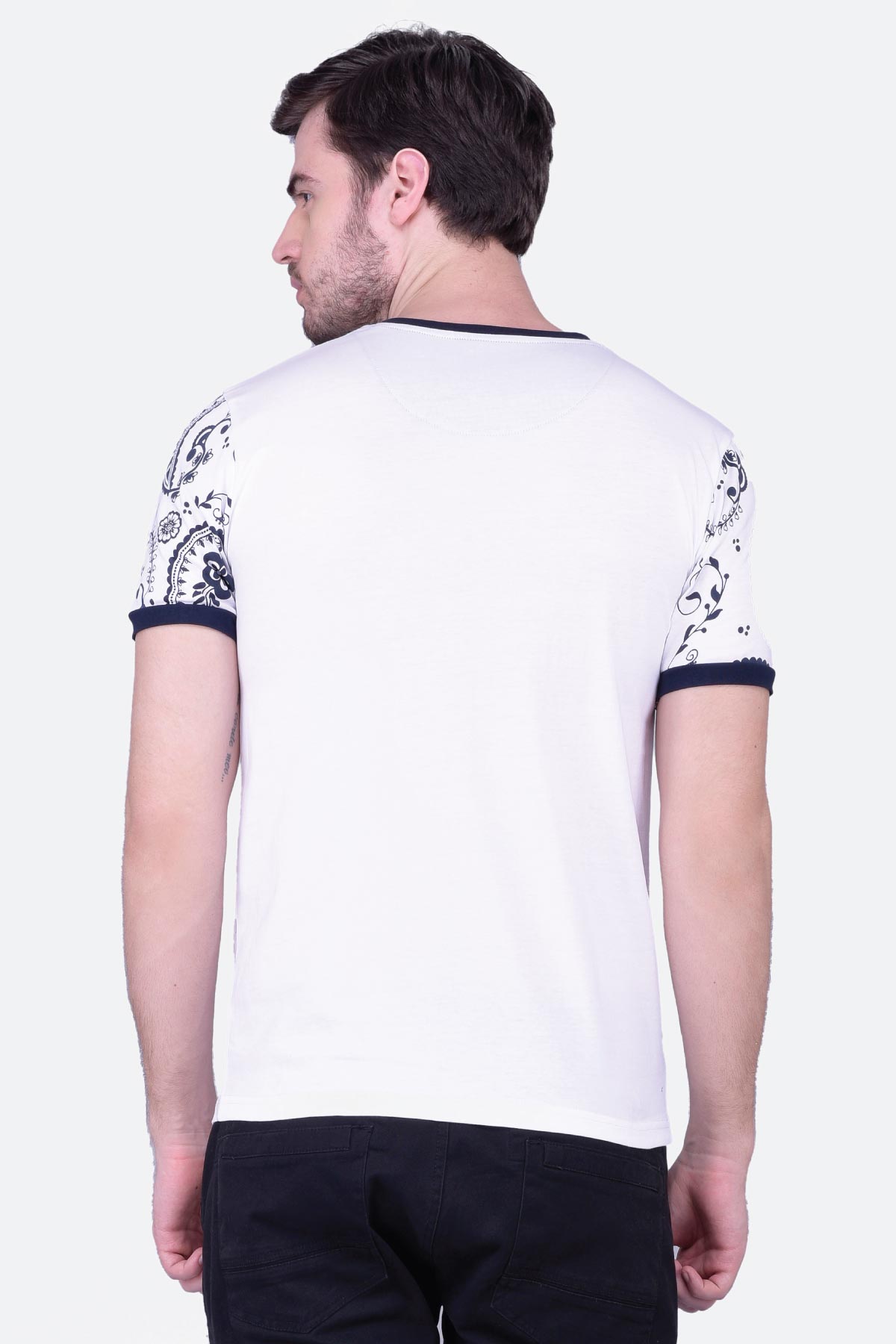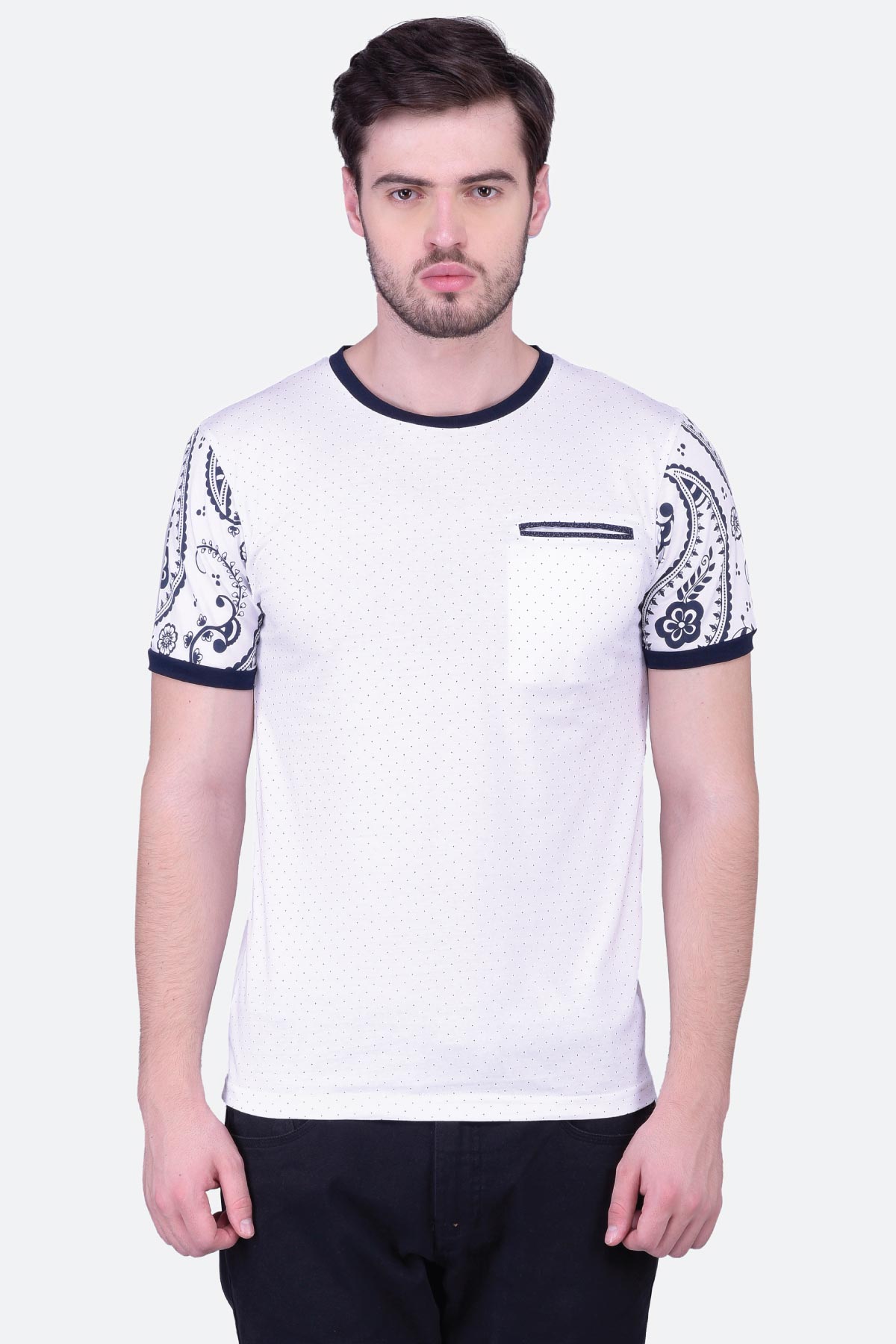 This half sleeve white printed cotton T-shirt for men will give you a classic look. The round neck design features paisley printed sleeves and a contrast neck, cuffs and welt pocket. Wear it with denim to up your charm