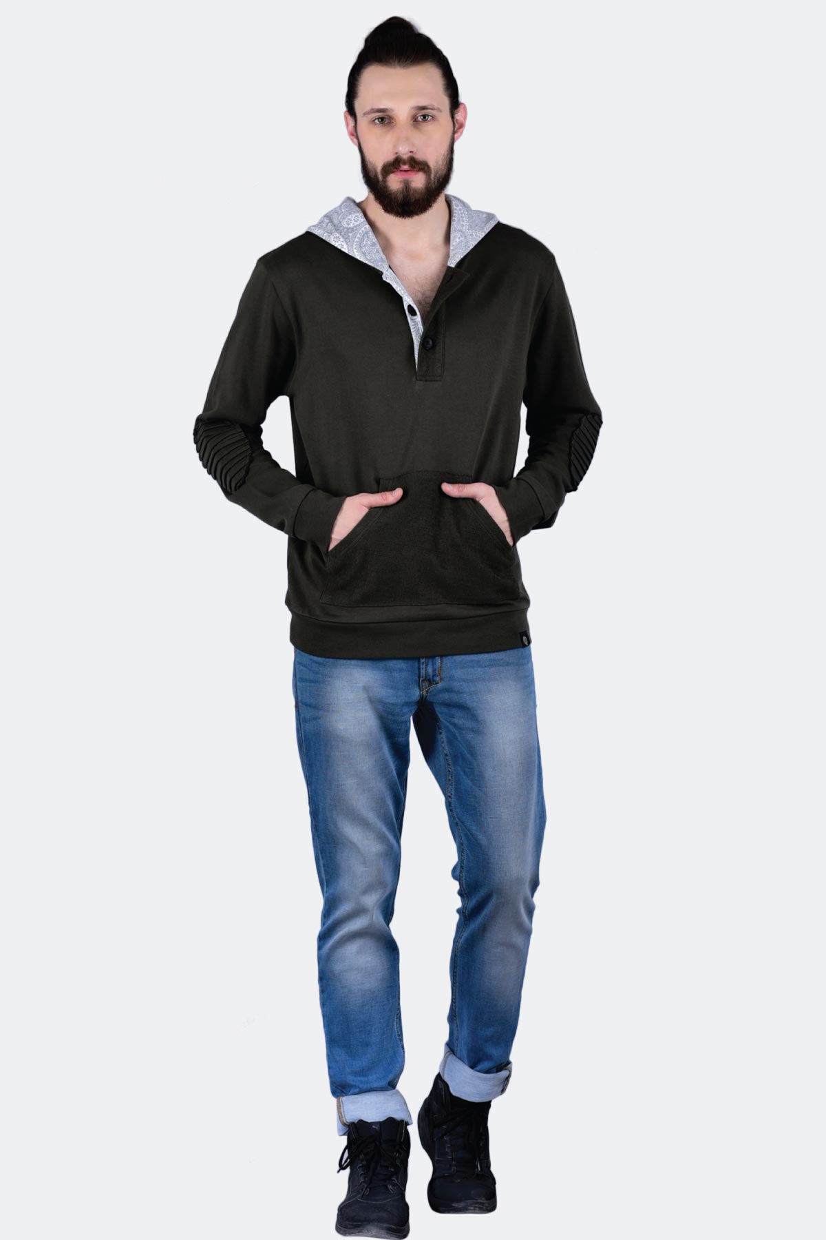 Don casual style effortlessly when you pull off this dark green sweatshirt for men. Made from cotton, this design features a kangaroo pocket and a contrast printed hoodie and inner placket. For a trendy look, club it with a pair of denim and plimsolls