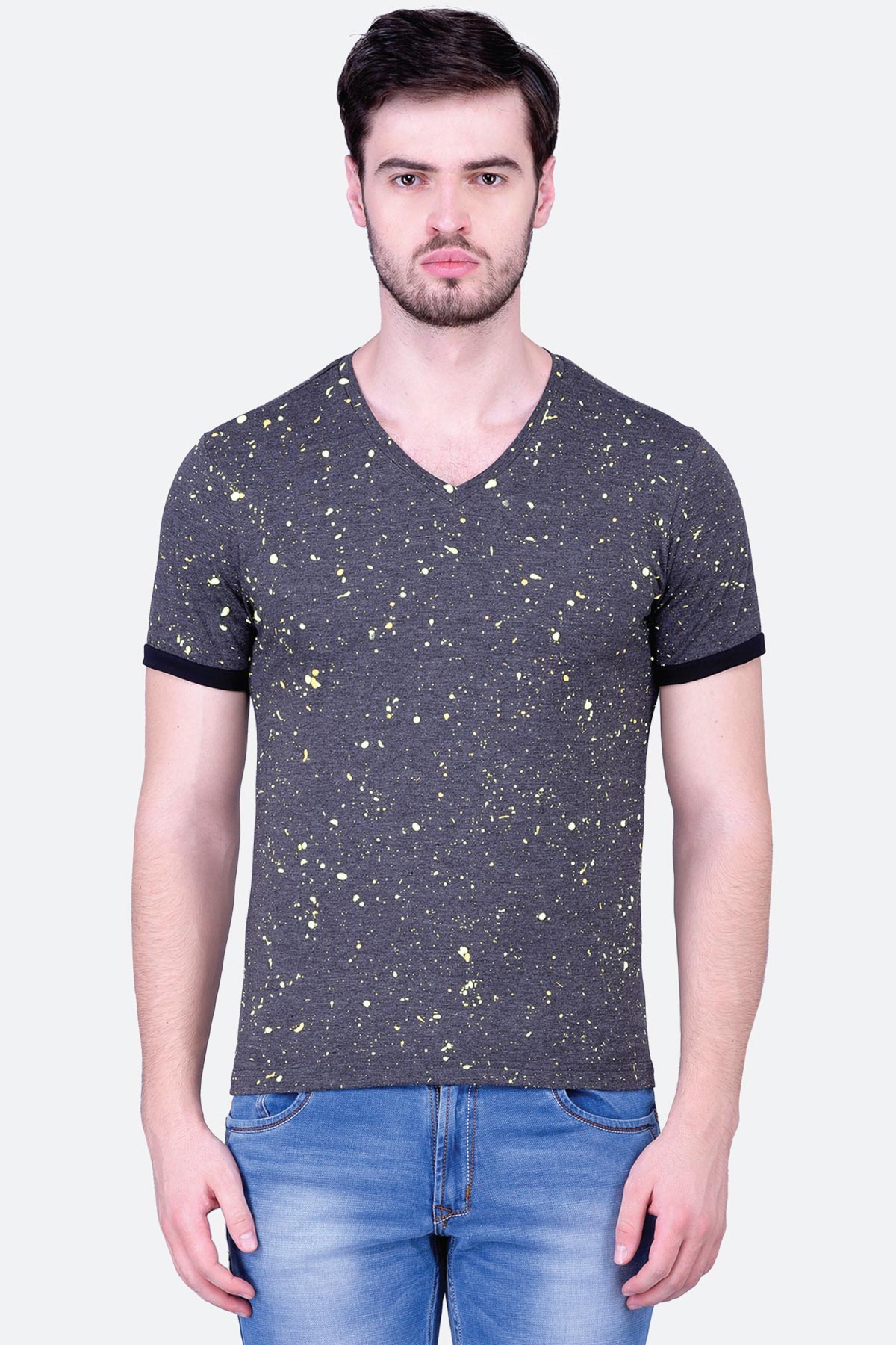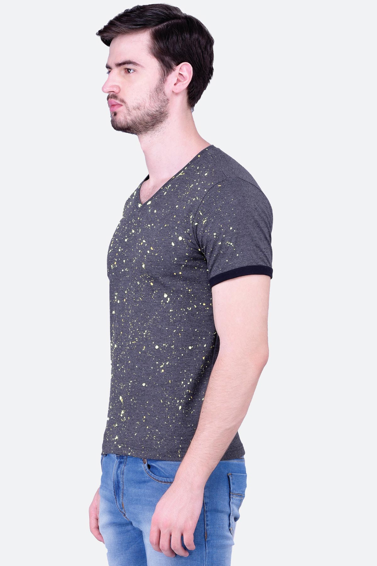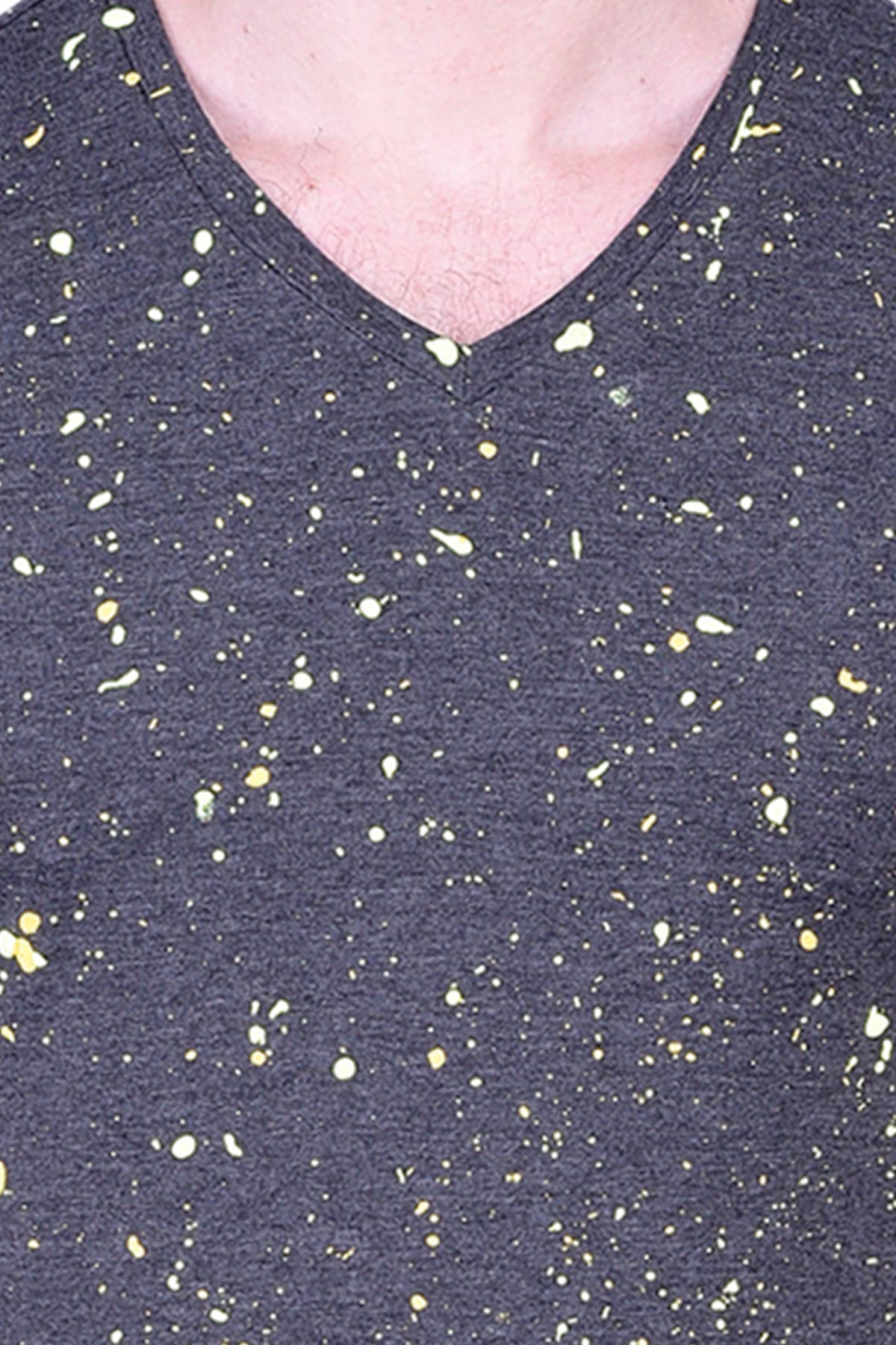 This charcoal coloured melange jersey T-shirt is the ideal pick for a trendy look this season. The design features fluorescent puff spray print on the front and contrast cuffs. Wear it with a pair of distressed denim to complete the ensemble.