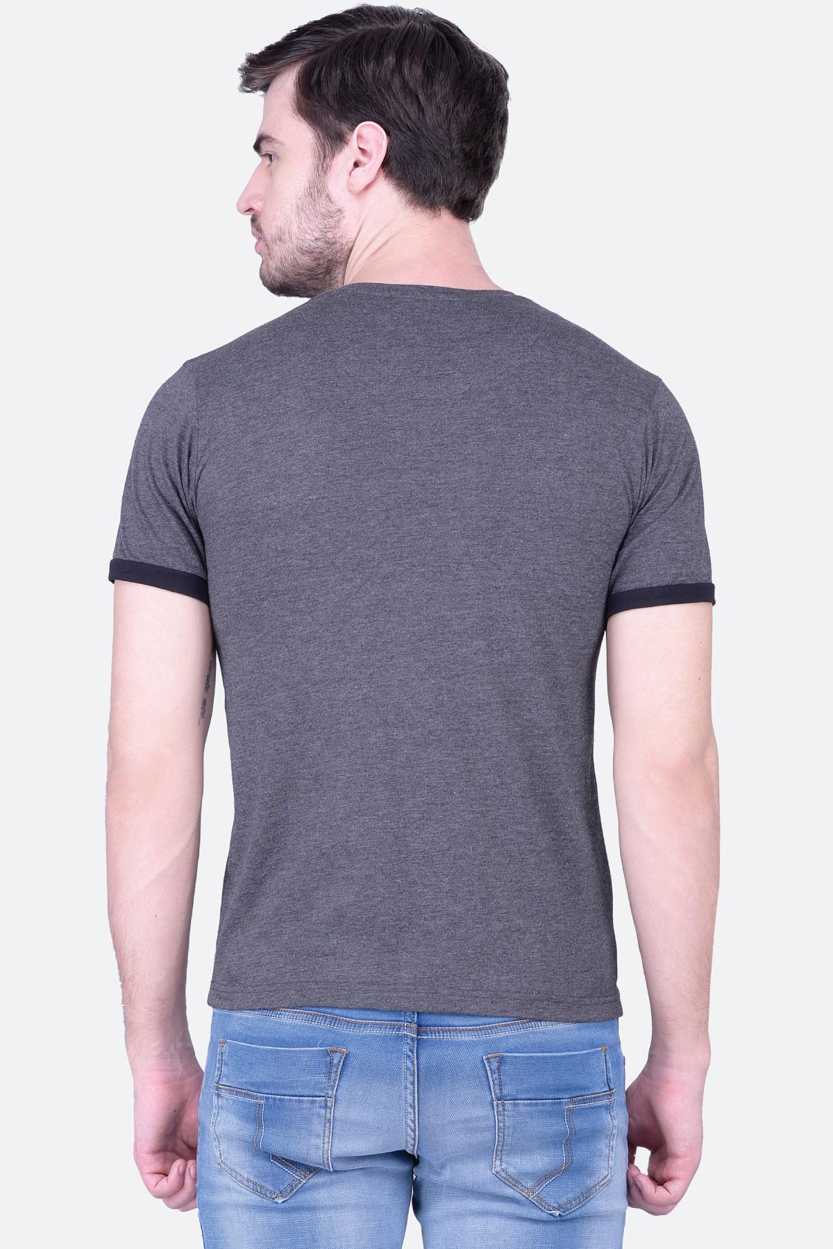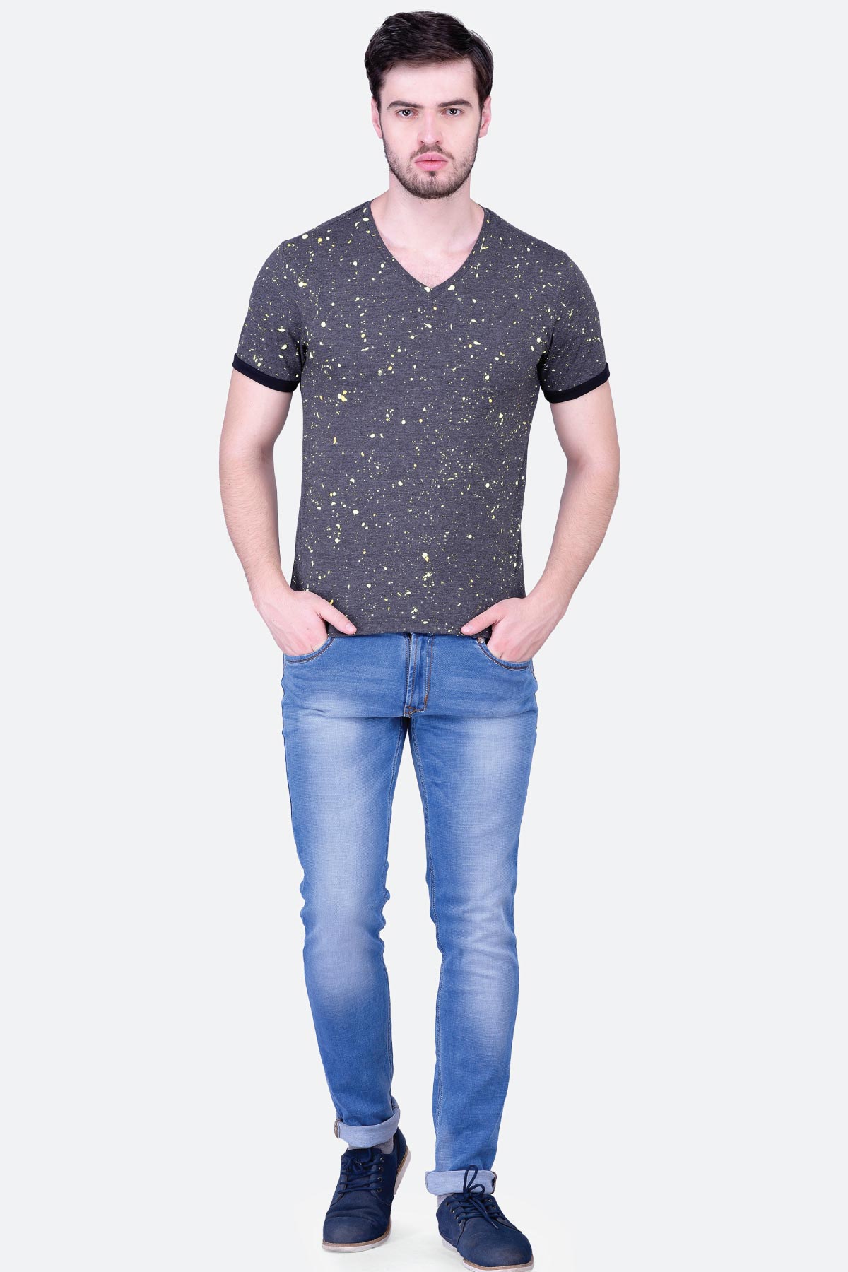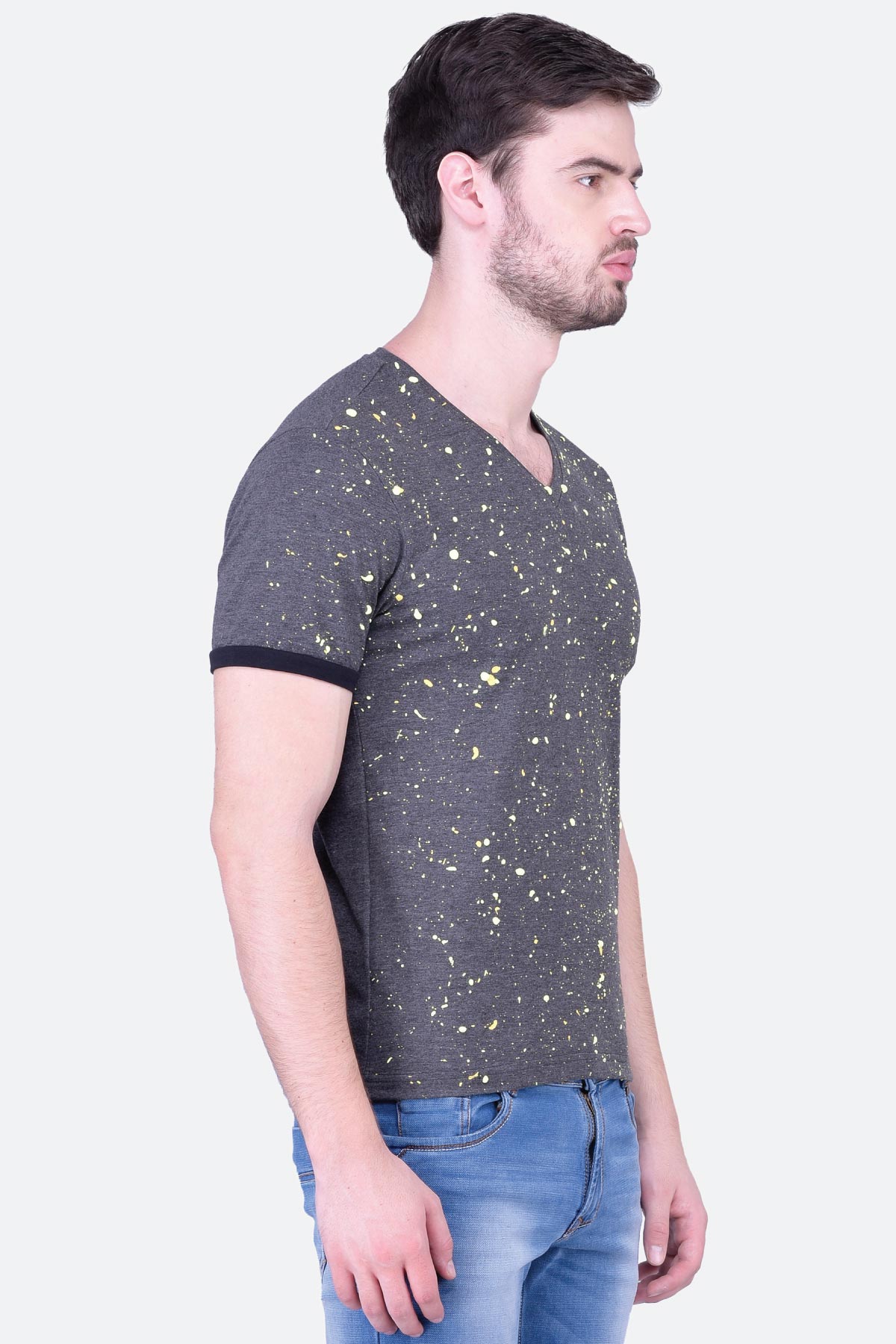 This charcoal coloured melange jersey T-shirt is the ideal pick for a trendy look this season. The design features fluorescent puff spray print on the front and contrast cuffs. Wear it with a pair of distressed denim to complete the ensemble.